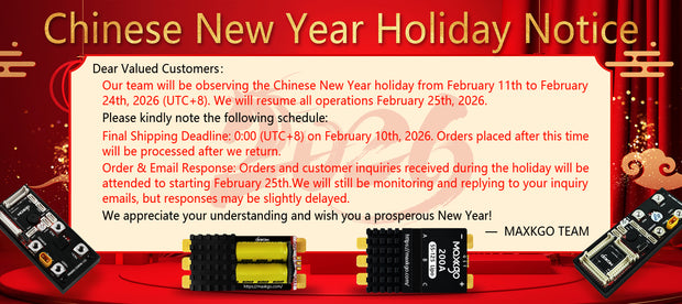 View options MAXKGO 5-12S 200A MINI Brushless Electric Speed Controller AM32 Firmware Support for Multi-rotor drones Airplane Models Plant Protection Machine Boat Models RC Car Models $96.00 - $101.00 View options View options MAXKGO 5-12S 120A Lipo Brushless ESC Brushless Electric Speed Controller AM32 Support 128KHz Frequency PWMFrequency Suitable for Multi-rotor Aircrafts Airplane Models Plant Protection Machine Boat Models RC Car Models $51.60 - $180.20 View options Sale -11% Quantity Add to cart MAXKGO FSESC6.8 60V 150A Underwater IP68 Waterproof ESC For DIY E-skateboard Efoil $125.00 $111.36 Quantity Add to cart Sale -14% View options MAXKGO MINIV6.8 ESC For DIY E-skateboard Scooter Ebike Go-Kart Robotics Speed Controller 1 review $76.00 - $100.00 View options View options SQESC 2670 Brushless ESC 2-6S Lipo powered 70A Firmware BLHeli_32 / AM32 Supports 128KHz PWM Frequency Suitable for FPV Racing Drone Multi-axis Drones Fixed-wing UAV Model Boats Climbing Vehicles $32.00 - $37.00 View options Sale -15% Quantity Add to cart ESC E70 G1 2-8S 70A High Performance Controller BLHeli_32-bit 128K 4-in-1 For FPV Racing Drone Racing Freestyle $88.00 $74.99 Quantity Add to cart Sale -35% Quantity Add to cart Flipsky 4S-20S 400A FT85GS ESC With Aluminum Case Enclosure NON-VESC For E-Foil Fighting Robot Surfboard AGV Robot $350.00 $227.00 Quantity Add to cart Sale -25% Quantity Add to cart Flipsky 75100 Dual Drive VESC ESC Speed Controller 84 V 240A Peak For E-Skateboard Scooter Ebike With Aluminum PCB Regenerative Capacity $230.00 $172.00 Quantity Add to cart View all
